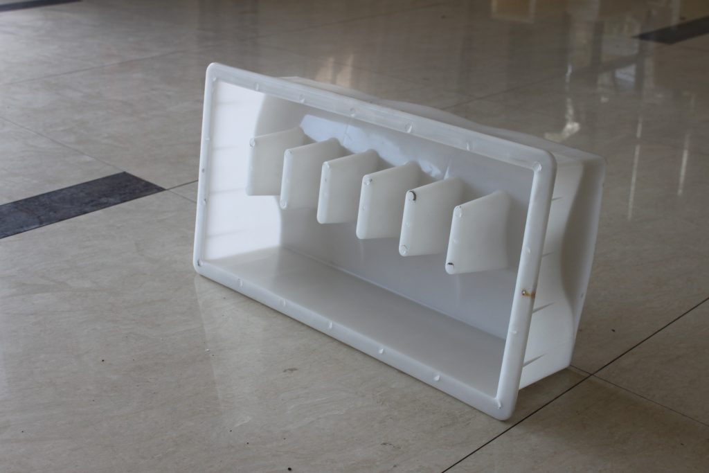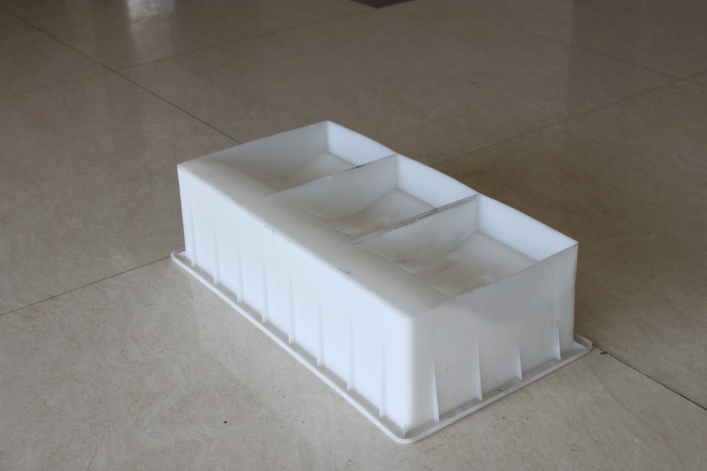 路牙石塑料模具整體外觀為長方形結(jié)構(gòu),因其尺寸較大,在模具的周邊及底部分別做了加強(qiáng)筋設(shè)計以保證在實際水泥路牙石澆筑過程中的穩(wěn)定性。從模具內(nèi)部的結(jié)構(gòu)我們可以看出,塑料路牙石模具主要采用了S型坡面設(shè)計,六個塑料堵頭,即所制水泥路牙石的六個排水孔,實際應(yīng)用較多的道路段為易積水或地理位置較低區(qū)域。