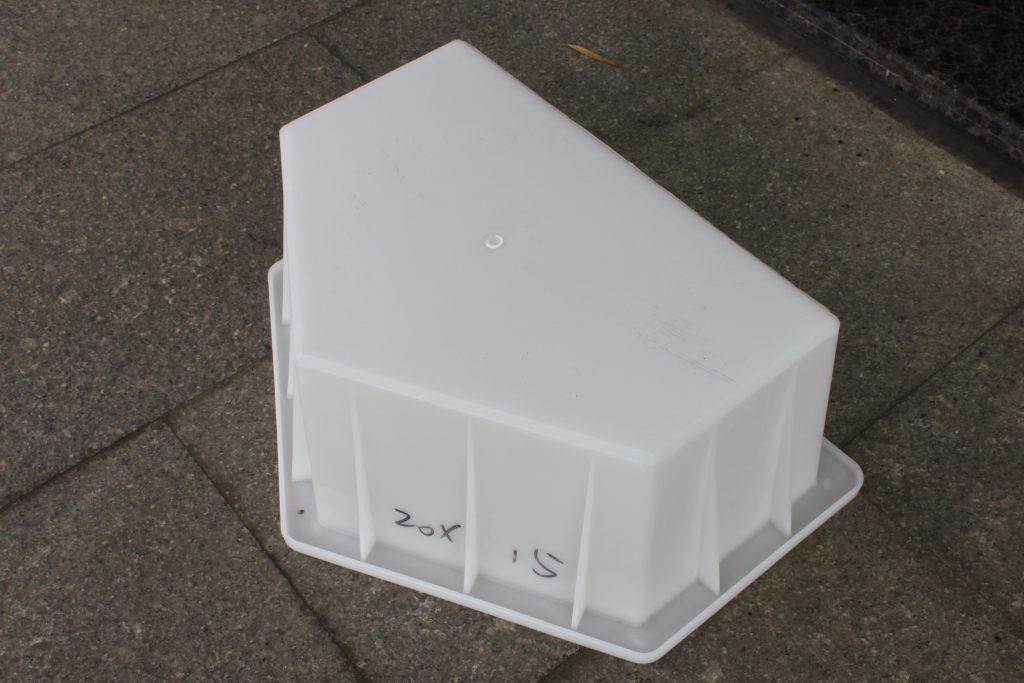 這是在眾多水泥制品模具中應用范圍相對較小的五角護坡磚塑料模具,主要采用了PP聚丙烯樹脂材質,經過注塑機熱熔成型,為增強實際水泥澆筑施工使用,在護坡磚塑料模具外圍均采用了加強筋設計,防止水泥混凝土注入過量導致模具變形,對于保障長期重復使用極為關鍵。