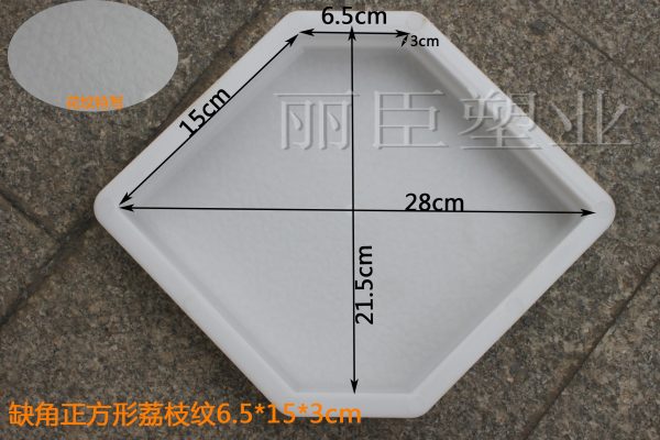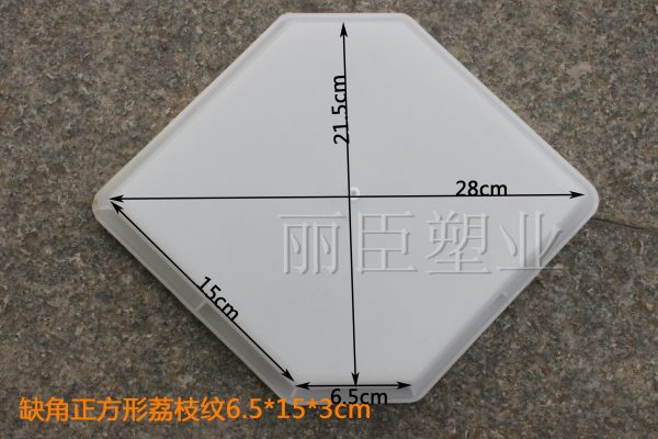 此產(chǎn)品專供西安客戶的一款彩磚模具,主要結(jié)構(gòu)以正方形缺角形狀設(shè)計(jì),其中底部為荔枝紋圖案,即所預(yù)制水泥彩磚成品表面為防滑荔枝紋圖案。此西安彩磚模具對(duì)角對(duì)稱長(zhǎng)度為28CM,缺角對(duì)稱長(zhǎng)度為21.5CM,詳細(xì)見下圖。