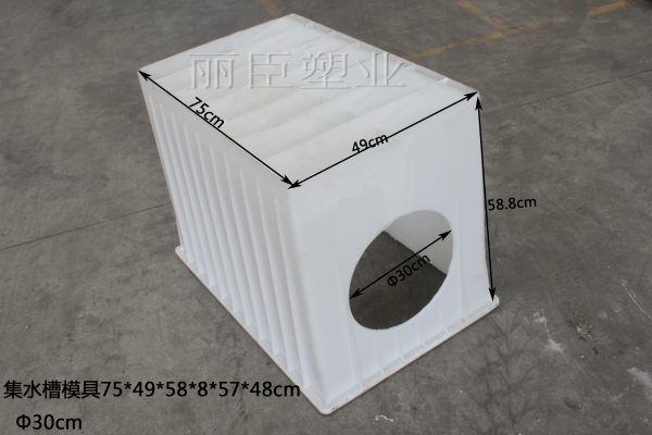 此款產品為客戶定制水泥集水槽模具,使用全新聚丙烯塑料原料,其中集水槽模具長度為75厘米,寬度為49厘米,深度積水區高度為57厘米,稍淺積水區為58.8厘米,實際高度深淺主要取決于預制水泥集水槽成品,具體詳細尺寸可參考下圖: