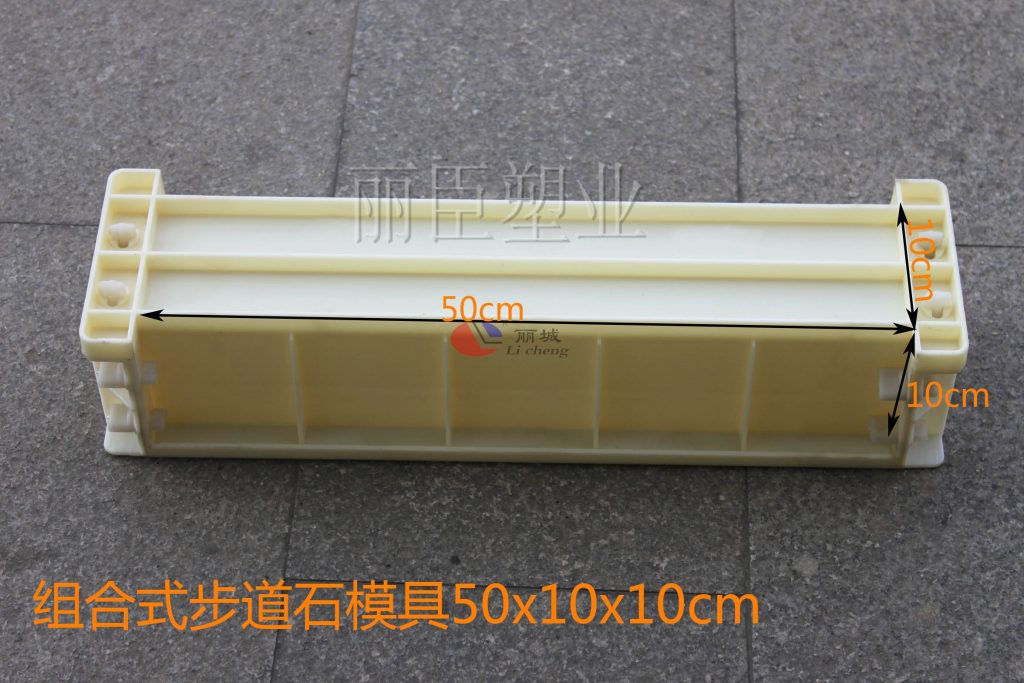 組合式步道石模具在用料上依舊采用ABS材質來作為主要生產原料,ABS材質澆筑成型的水泥步道石澆筑過程中不易發生變形,其運輸中就算是過度的綁扎也不會對步道石模具產生影響,因其可以進行拆分使用,50x10x10cm與25x10x10cm模具之間其使用的兩邊堵頭都是一致,所以在先前購買25長步道石模具的客戶在后買50長的步道石過程中可以減少購買堵頭的數量,依舊可以使用25長的步道石堵頭。